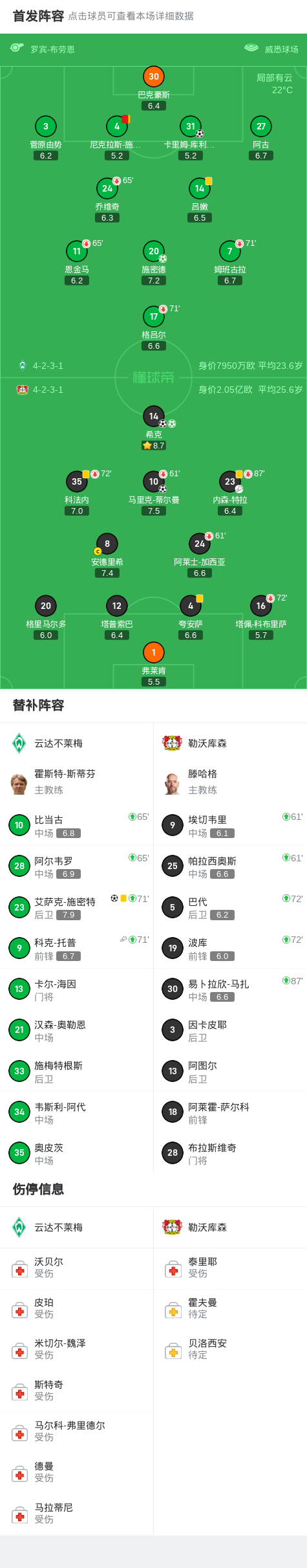 第43分钟,姆班古拉造点,施密德操刀点射命中,不莱梅1-2